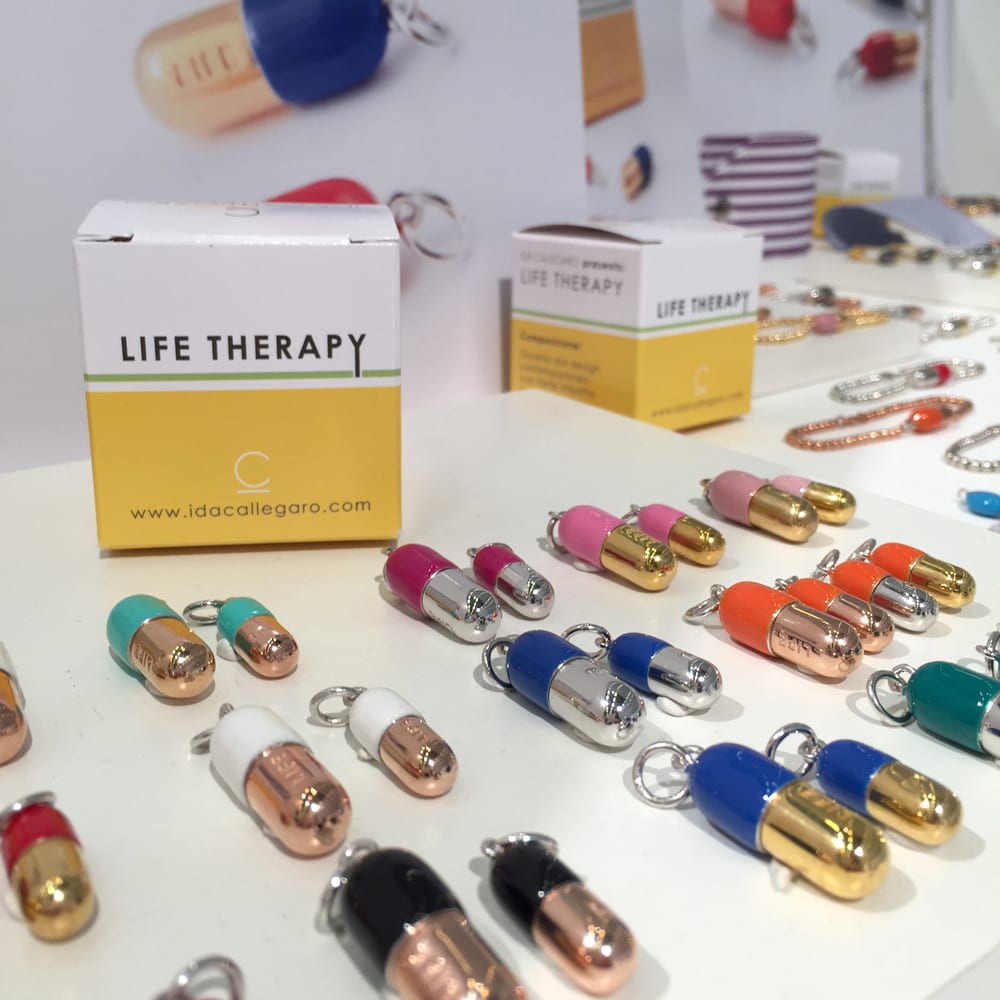 Ida Callegaro et sa collection life therapy, une bonne dose d’humour à porter sous forme de gélules ou de petites pilules .