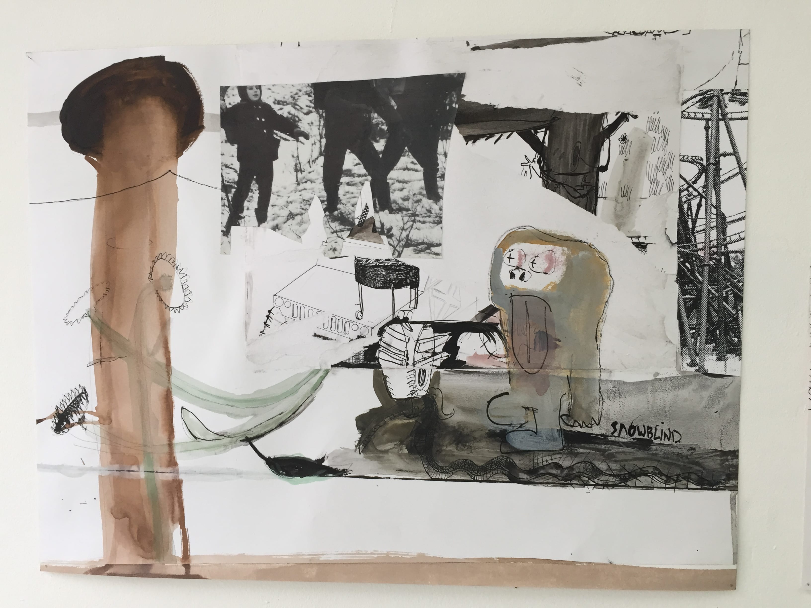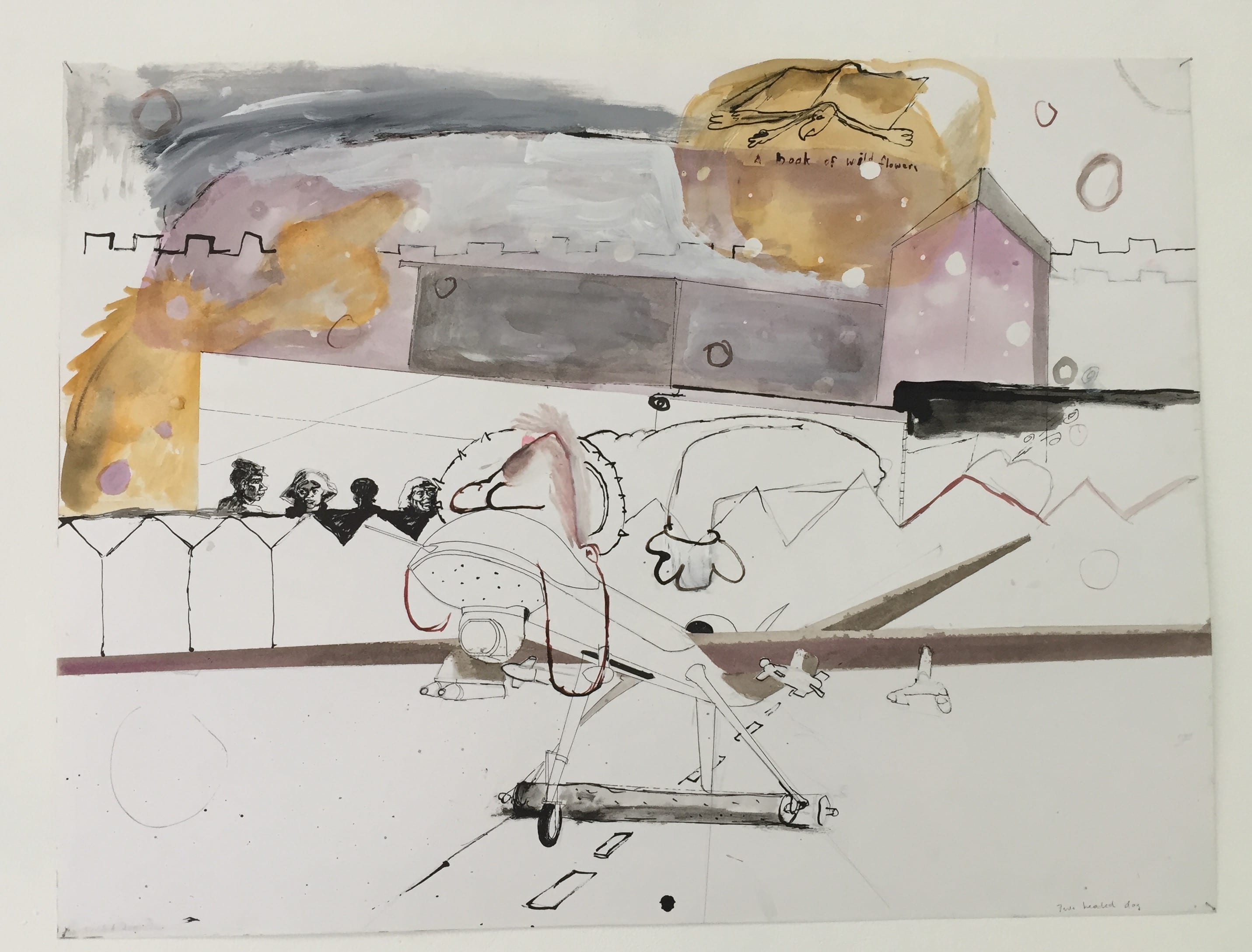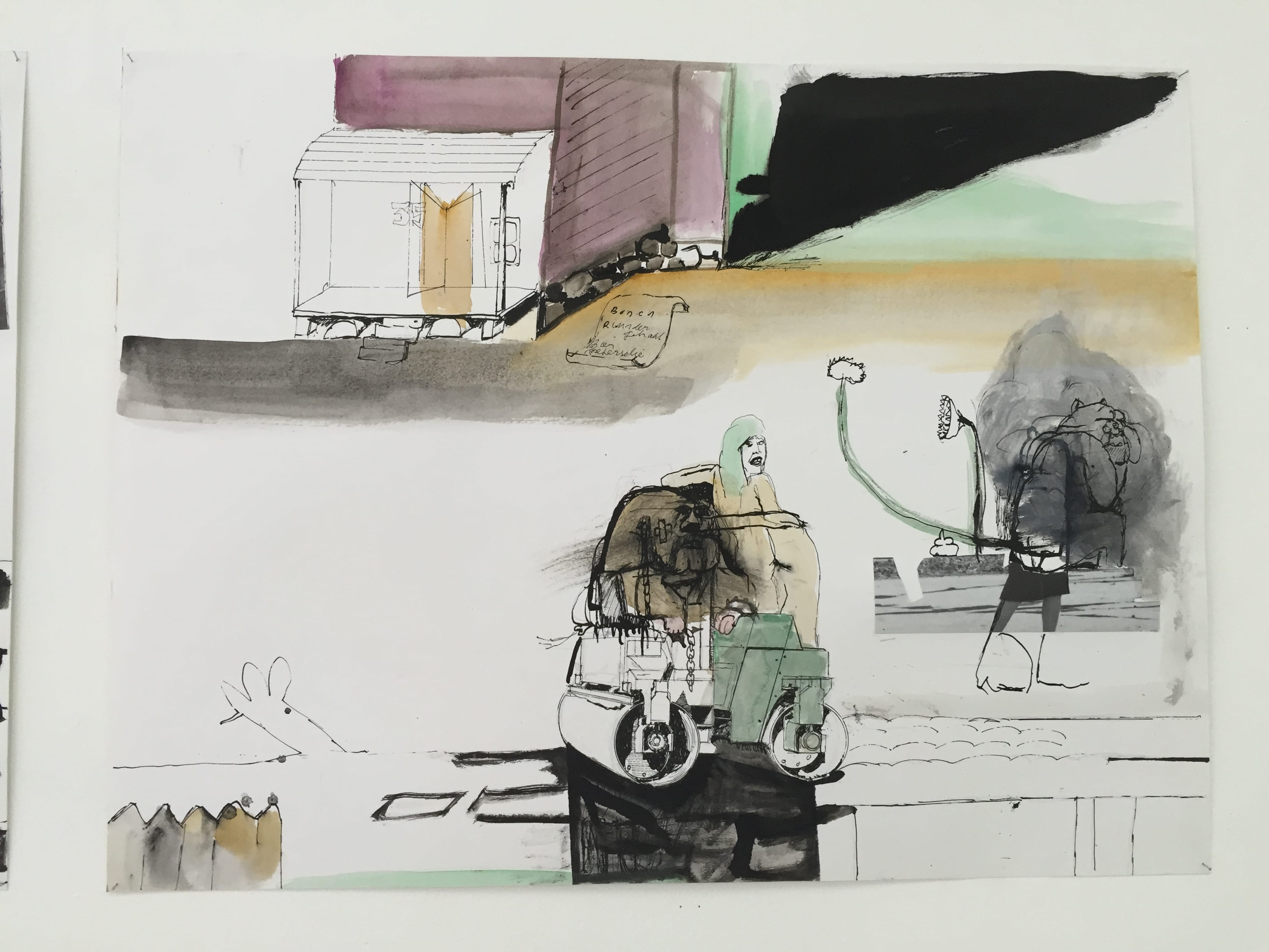 Ce sont des œuvres faites de gouache, encre, collages sur papier blanc. La ville est présente par ses traits , ébauche d’architectures, ses moyens de locomotion, les hommes sont caricatures, mal formés. Peu de couleurs, le blanc est présent, complété par des mots, des gribouillis, des taches.
