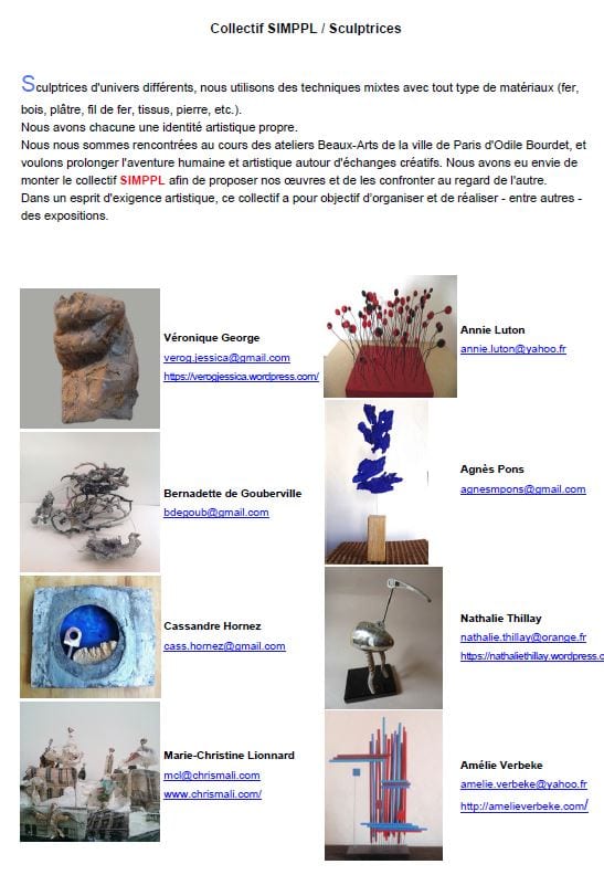 J’y serais avec mon collectif de sculptrices « SIMPPL » *. Nous sommes les invitées de Jeanne Julien, créatrice de mobilier,décorateur d’intérieur . Nous investissons le hall du bâtiment à l’étage des terrasses. Vous serez séduit par le lieu ou vues sur Paris et herbes vertes vous attendent.